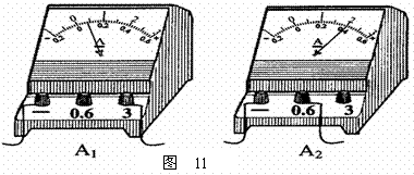 某同學(xué)希望通過比較電路中不同位置的電流表的讀數(shù)來研究串聯(lián)電路的電流規(guī)律.所接電路圖如圖10所示,閉合開關(guān)后,兩電流表指針偏轉(zhuǎn)情況如圖11.