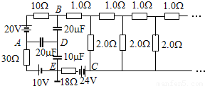 如圖所示的電路中,各電源的內(nèi)阻均為零,其中B、C兩點(diǎn)與其右方由1.0Ω的電阻和2.0Ω的電阻構(gòu)成的無(wú)窮組合電路相接.求圖中10μF的電容器與E點(diǎn)相接的極板上的電荷量.