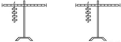 在做“研究杠桿平衡條件”的實驗時,掛鉤碼前,使杠桿在水平位置平衡.實驗時只有10個相同的鉤碼,杠桿每格等距.當在A點掛上4個鉤碼時(如下圖所示),要使杠桿在水平位置平衡,請你設(shè)計兩種方案并分別在圖中標出鉤碼的個數(shù)和位置.