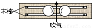 一次探究活動中,小強先在水平桌面上固定兩根平行的小棒,接著在小棒上放了間隔一定距離的兩個乒乓球,如圖所示.然后,他向兩個乒乓球中間的間隙用力吹氣,則兩乒乓球將