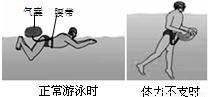 有一種被稱作“跟屁蟲”的輔助裝備是游泳安全的保護(hù)神,如圖所示.“跟屁蟲”由一個(gè)氣囊和腰帶組成,兩者之間由一根線連接.正常游泳時(shí),連接線是松馳的,氣囊漂浮著,跟人如影相隨.在體力不支等情況下,可將氣囊壓入水中,防止人下沉,在此情況下( )
