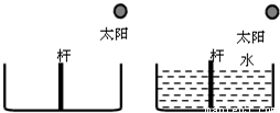 如圖是兩個(gè)并排而且深度相同的水池,一個(gè)裝水,另一個(gè)未裝水,在兩池的中央各豎立著一只長(zhǎng)度相同而且比池深略高的標(biāo)桿.當(dāng)陽(yáng)光斜照時(shí)就會(huì)在池底形成桿的影子,下列說(shuō)法正確的是( )