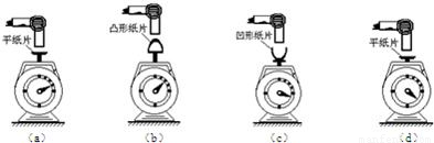 小明同學(xué)學(xué)習(xí)了“力”有關(guān)知識(shí)后,決定探究“風(fēng)”對(duì)紙片作用力的大。秒姶碉L(fēng)、測(cè)力計(jì)、迎風(fēng)面積相同但迎風(fēng)面形狀不同的紙片做了如圖(a)、(b)、(c)、(d)所示的實(shí)驗(yàn).其中,圖(a)、(b)、(c)三次實(shí)驗(yàn)時(shí)電吹風(fēng)的風(fēng)速相同,圖(d)實(shí)驗(yàn)時(shí)電吹風(fēng)的風(fēng)速比前三次實(shí)驗(yàn)時(shí)的風(fēng)速大.請(qǐng)根據(jù)實(shí)驗(yàn)現(xiàn)象及相關(guān)條件,歸納得出初步結(jié)論.