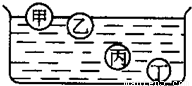 甲、乙、丙、丁是四個(gè)形狀體積都相同而材料不同的球體,它們?cè)谒徐o止的情況如圖所示,其中所受浮力最小的是( )