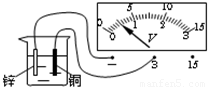 如圖所示,在燒杯中加些鹽水,然后將連在電壓表上的銅片和鋅片插入鹽水中,這樣就制成了一個(gè)電池.觀察電壓表指針的偏轉(zhuǎn)與接線可知:這個(gè)電池的電壓是______V,______片是它的正極.