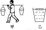 今年初,河池大部分地區(qū)出現(xiàn)了嚴(yán)重的旱災(zāi),人畜飲水困難,許多群眾需要到很遠(yuǎn)的地方挑水飲用.小宇同學(xué)在挑水時(shí)為防止水濺出桶外,在水面上放上一薄木板,如圖乙所示,木板有3/4的體積沒入水中.若該木板的體積為200cm