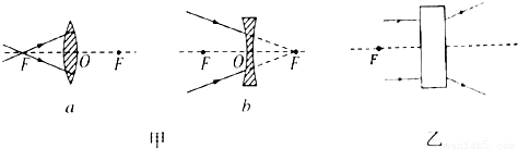 如圖甲所示,請畫出光線分別通過a、b透鏡后的傳播方向.如圖乙所示,根據(jù)入射光線和折射光線,在圖中的虛線框內(nèi)畫出適當(dāng)?shù)耐哥R.