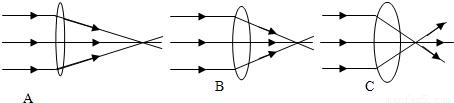 小華在學(xué)習(xí)了《透鏡》后,想到了一個問題:如果讓平行光通過厚度不同的凸透鏡,它們對光線的會聚能力會有什么不同呢?于是他在實(shí)驗(yàn)室用一束平行光分別經(jīng)過凸透鏡A、B、C,并得到如圖所示的光路圖.