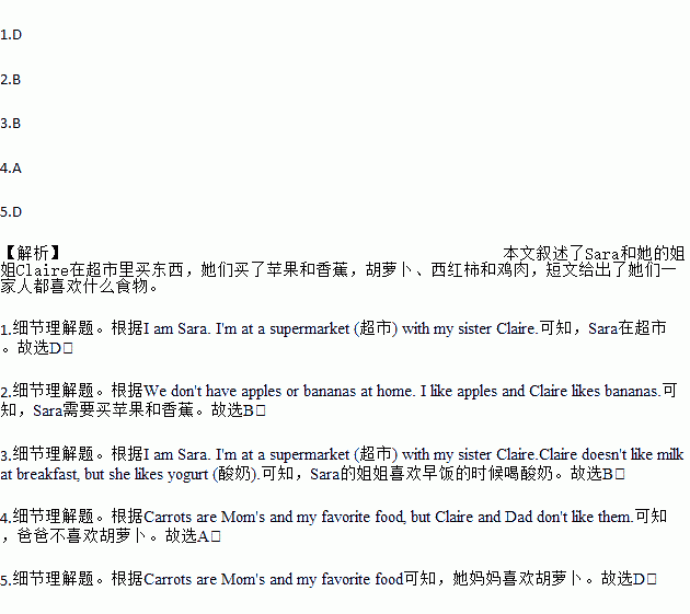 查看答案I am Sara. I'm at a supermarket (超市) with my sister Claire. Claire and I like buying things at the supermarket, but my parents don't. They like buying things at small stores.