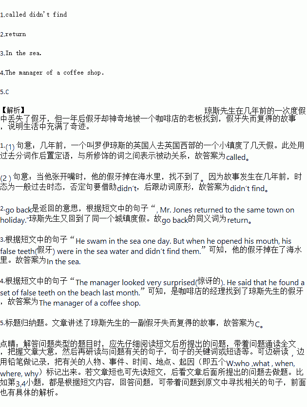 A few years ago, an Englishman (1) _______ (call) Roy Jones went to a small town in the westof England for a few days' holiday. He swam in thesea one day. But when he opened his mouth, hisfalse teeth(假牙) were in the sea water and he(2) _______ (not find) them. The next year, MrJones returned to the same town on holiday. Oneday, he had dinner in a coffee shop. He told thestory of his lost teeth to the manager. The manager looked very surprised(驚訝的). He said that hefound a set of false teeth on the beach last month.Then he asked Roy Jones to try them on. "OK,"said Mr Jones, "I think they may be mine." WhenMr Jones put the teeth into his mouth, he was happy. They were really his lost teeth!