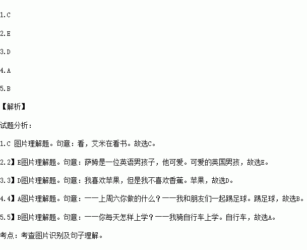 根據句子的意思,選擇正確的圖片填空。(每小題1分,共5分)