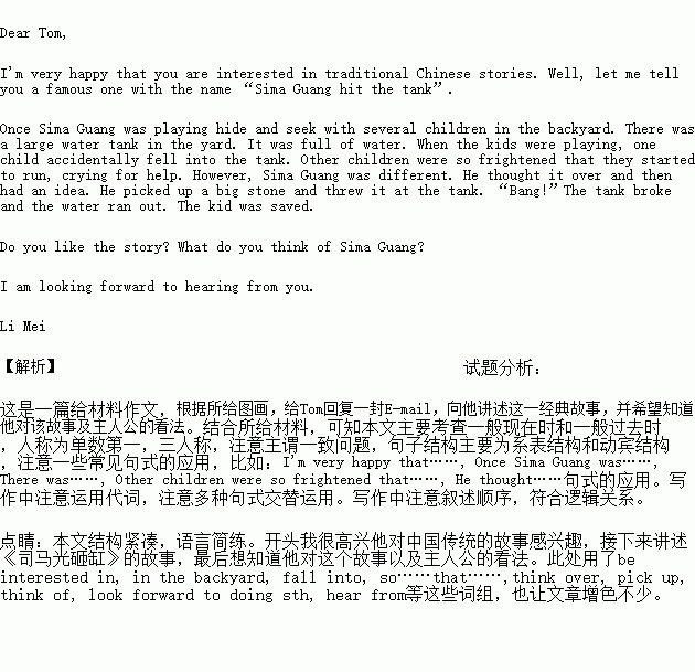 假如你是李梅。你的美國筆友Tom在昨天的E-mail中告訴你,最近他對(duì)中國文化產(chǎn)生了濃厚的興趣,希望你能給他介紹一些經(jīng)典故事。請(qǐng)你根據(jù)下面所給圖畫,給Tom回復(fù)一封E-mail,向他講述這一經(jīng)典故事,并希望知道他對(duì)該故事及主人公的看法。