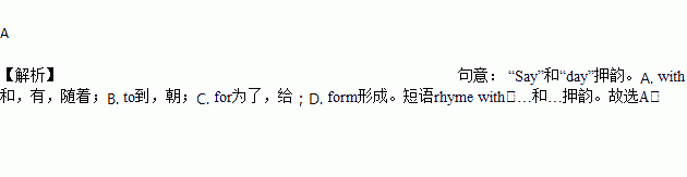 A 【解析】句意: “Say”和“day”押韻。A. with和,有,隨著;B. to到,朝;C. for為了,給;D. form形成。短語rhyme with:…和…押韻。故選A。windy weather it is today!