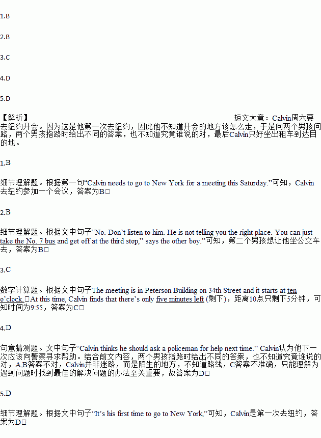 1.B 2.B 3.C 4.D 5.D 【解析】短文大意:Calvin周六要去紐約開會(huì)。因?yàn)檫@是他第一次去紐約,因此他不知道開會(huì)的地方該怎么走,于是向兩個(gè)男孩問路,兩個(gè)男孩指路時(shí)給出不同的答案,也不知道究竟誰說的對(duì),最后Calvin只好坐出租車到達(dá)目的地。 1.B 細(xì)節(jié)理解題。根據(jù)第一句“Calvin needs to go to New York for...