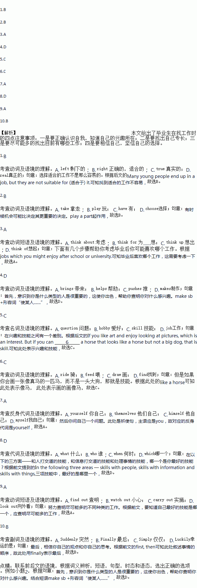 Finding a job is not the same as choosing a job. Many young people end up in a job, but they are not suitable for (適合于) it. Sometimes chance may __________ a more important part than a decision. Here are a few steps to help you __________ jobs which you might enjoy after school or university.