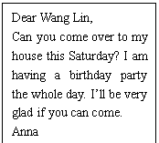 請仔細(xì)閱讀Anna寫給Wang Lin的邀請信,然后以Wang Lin的名義寫一個回信要求:
