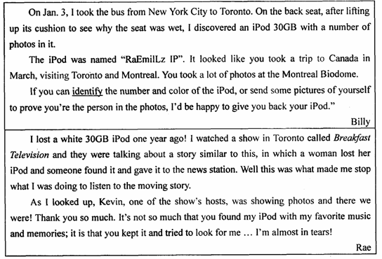C. The lost iPod was white. D. Rae sent some photos to Billy.