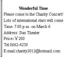 46. If you want to go to the Charity(慈善)Concert, you can book a ticket by ______________.