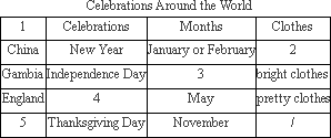 people live around the world.They like to have celebrations(慶;顒).In China, people celebrate New Year.New Year is in January or February.They wear red clothes because red is the color that will bring joy.Chinese children get money in red envelopes for the new year.In Gambia(岡比亞), people celebrate Independence Day(獨立日).It is in February.They wear bright clothes and play music at the celebration.In England, people celebrate May Day.May Day is in May.They wear pretty clothes to celebrate the coming spring.The children like to dance on this day.In America, people celebrate Thanksgiving Day(感恩節(jié)).It's in November.They have a very big dinner with their families or friends.They eat turkeys(火雞)and a lot of other delicious food.They have a long talk after the dinner.