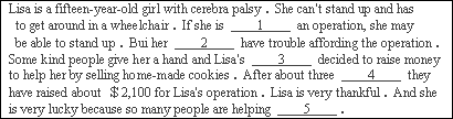 A group of fifteen-year-olds at Sunshine School are holding a charity sale to raise money to help their classmate Lisa.Lisa had cerebral palsy(大腦性癱瘓)when she was a baby.Although Lisa has to use a wheelchair to help her get around, she never gives up.And she is always ready to help others.