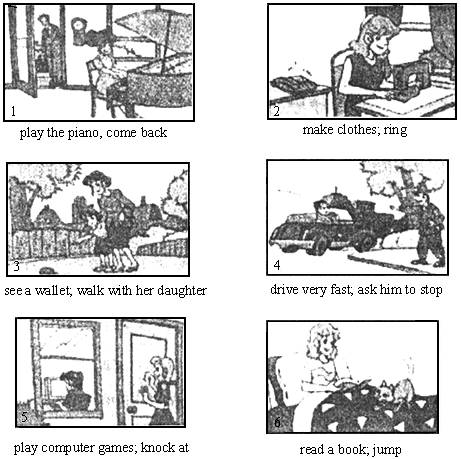 5. Picture 6: A cat ________ on the bed while the girl ________.