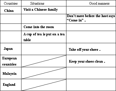 Different countries and different people have different manners.We must find out their customs, so that they will not think us impolite.Here are some examples of things that a person with good manners does or does not do.If you visit a Chinese family you should knock at the door first.When the door opens you will not move before the host says “Come in, please.” After you come into the room you won’t sit down until the host asks you to.When a cup of tea is put on a tea table before you or sent to your hand, you will say “Thank you” and receive it with your two hands, or they will think you are not polite.Before coming into the house in Japan it is good manners to take off your shoes.In European countries, if your shoes become very dirty, this is not done.In a Malay house, a guest never finishes the food on the table.He leaves a little to show that he has had enough.In England, a guest always finishes a drink or the food to show that he has enjoyed it.This will make the host very pleased.