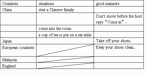 Different countries and different people have different manners. We must find out their customs, so that they will not think us impolite. Here are some examples of things that a person with good manners does or does not do. If you visit a Chinese family you should knock at the door first. When the door opens you will not move before the host says "Come in, please. " After you come into the room you won't sit down until the host asks you to. When a cup of tea is put on a tea table before you or sent to your hand, you will say "Thank you" and receive it with your two