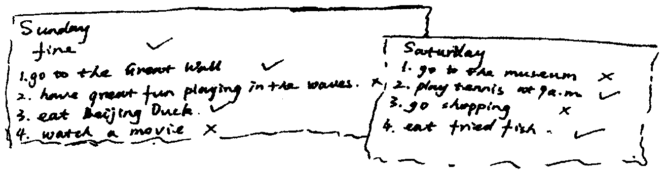 請回憶一下,你去年都做了些什么樣的事情。你可以選擇使用上一題中的動(dòng)詞短語,也可以運(yùn)用自己學(xué)過的動(dòng)詞。