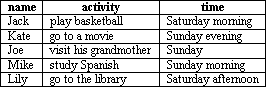 上星期,我們采訪了幾位同學(xué),得知他們的業(yè)余生活豐富多彩,現(xiàn)在請你根據(jù)表格向大家介紹一下他們周末都做了些什么。