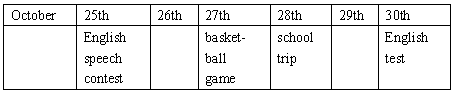 根據(jù)下列表格用幾句話寫出10月份學(xué)校將開展的課外活動(dòng)安排。字?jǐn)?shù)在60字左右.(12分)