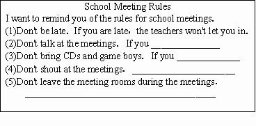 請(qǐng)你幫助老師制定開校會(huì)的規(guī)則,根據(jù)提示完成句子.