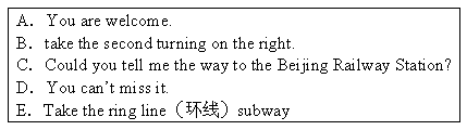 (地鐵)station there. 3_______and you can go straight to the Beijing Railway Station.John Smith: Go down the street, take the second turning on the right and then take the subway to the Beijing Railway Station.