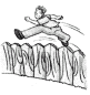The man jumps ________ to get ________ the fence.