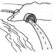 The road goes ________ the river and ________ the hill.