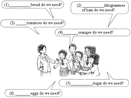 The Principal agrees that the students can sell sandwiches and orange juice at the show. The Class 1, Grade 7 students are asking their Maths teacher, Miss Lan, about the things they need to buy. Help them complete their questions with‘How much’and‘How many’.