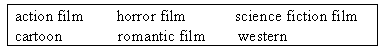 Millie is in a video rental shop. She wants to rent a VCD. Look at the information on the back covers of the VCDs. Help Millie guess what types of films they are. Write the correct names in the blanks.