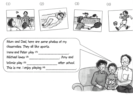 I live in a (3)__________ with my mother, my mother, my father and my sister, Stella. How many people are there in your family? What are your (4)_________? I like playing (5) __________ games and (6) __________ phone cards. Can you send me a phone card from Beijing? I also like sports. My (7) __________ sport is tennis. Do you like Andre Agassi? I think he is great! When I grow up, I want to be a tennis player. What about you?