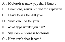 A:We’ve got all kinds of mobile phones here.Which do you prefer, Simens, Nokia or Motorola?