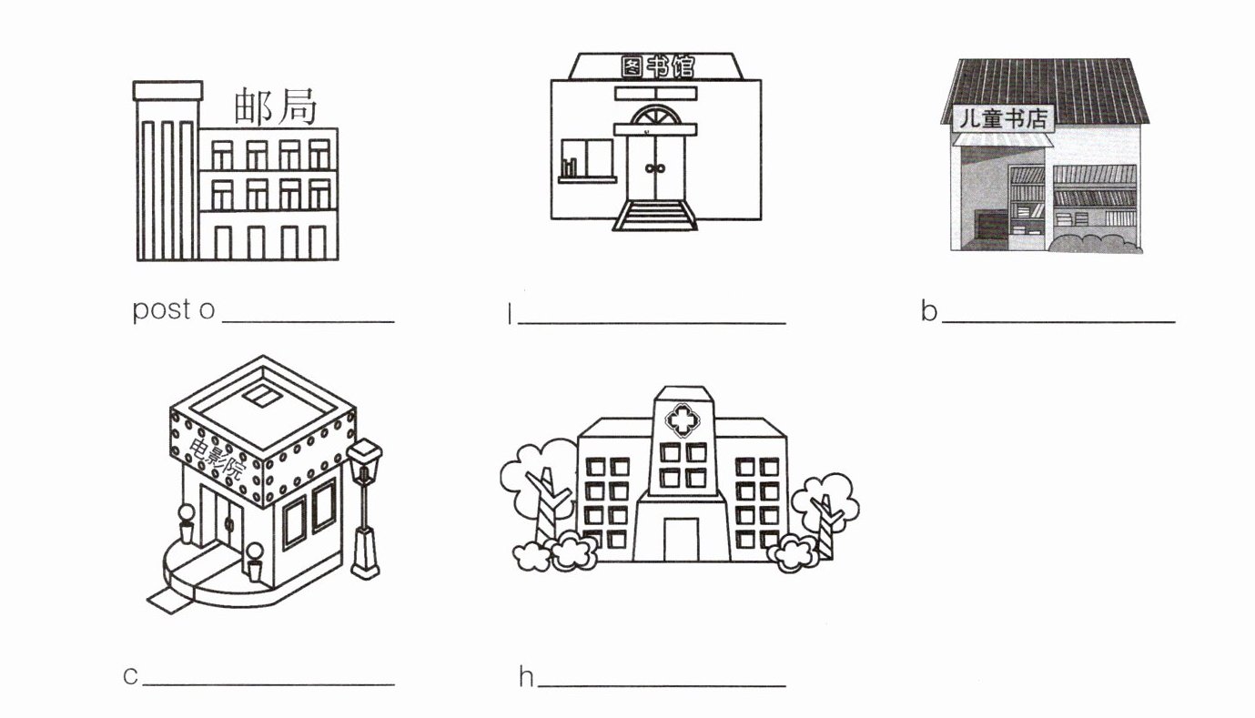 第一圖為“郵局”,對應(yīng)英文“post office”,首字母提示“o”,故填“office”;第二圖為“圖書館”,英文“l(fā)ibrary”,首字母“l(fā)”,填“l(fā)ibrary”;第三圖“兒童書店”,“書店”是“bookstore”,首字母“b”,填“bookstore”;第四圖“電影院”,英文“cinema”,首字母“c”,填“cinema”;第五圖醫(yī)院標志,“醫(yī)院”“hospital”,首字母“h”,填“hospital”。