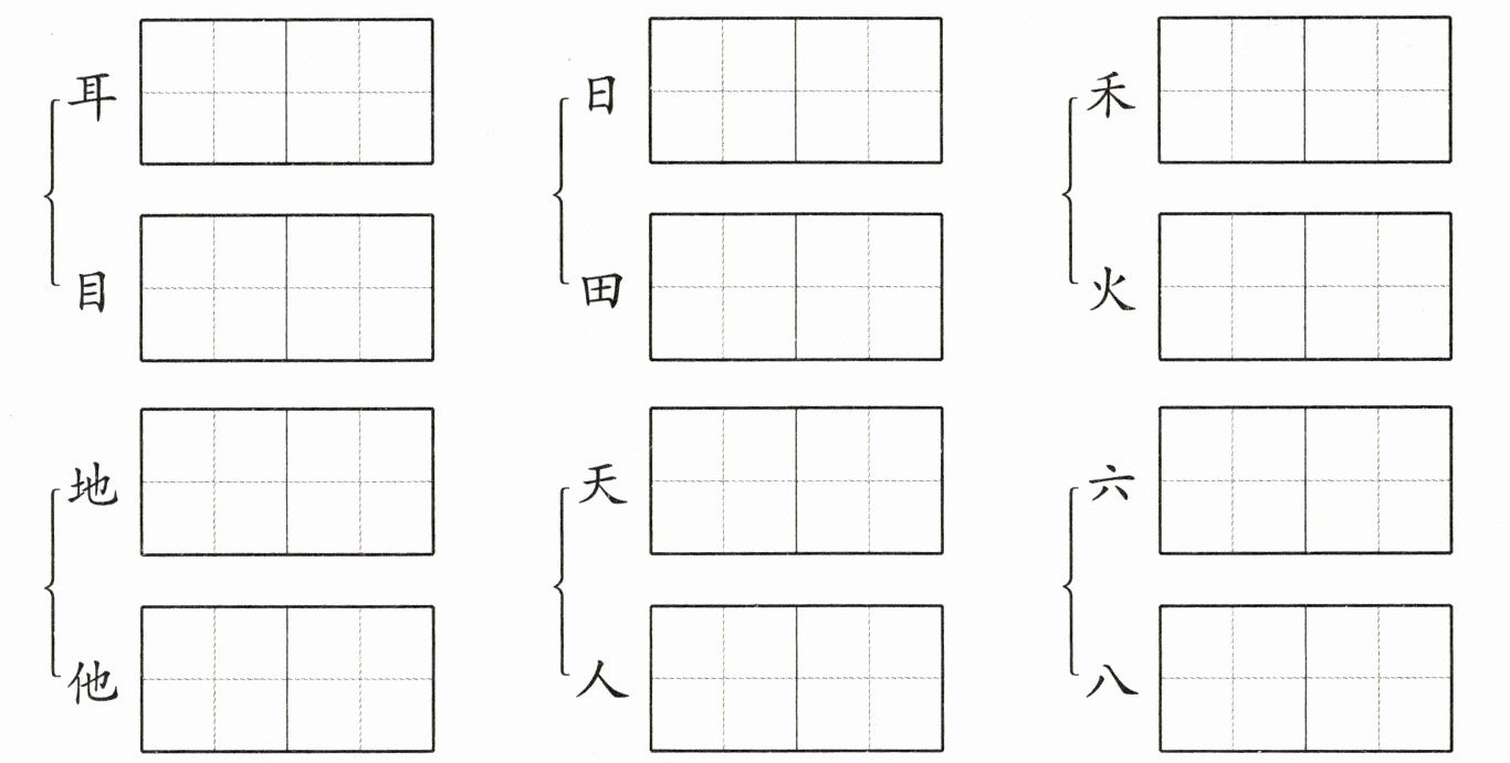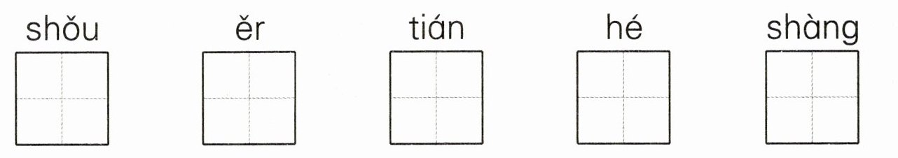 根據(jù)拼音“shǒu”寫出“手”,“ěr”寫出“耳”,“tián”寫出“田”,“hé”寫出“禾”,“shàng”寫出“上”。