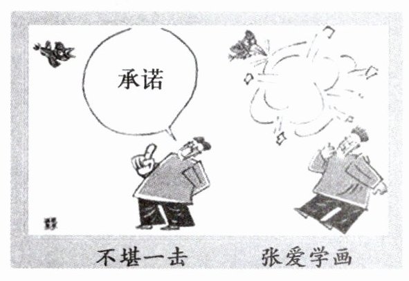 答案:B;漫畫表明不思考自身能力是否可以兌現(xiàn)承諾而輕易承諾,最終會導(dǎo)致失信,選項(xiàng)B表明輕易發(fā)出諾言必然導(dǎo)致信用匱乏,二者相符。