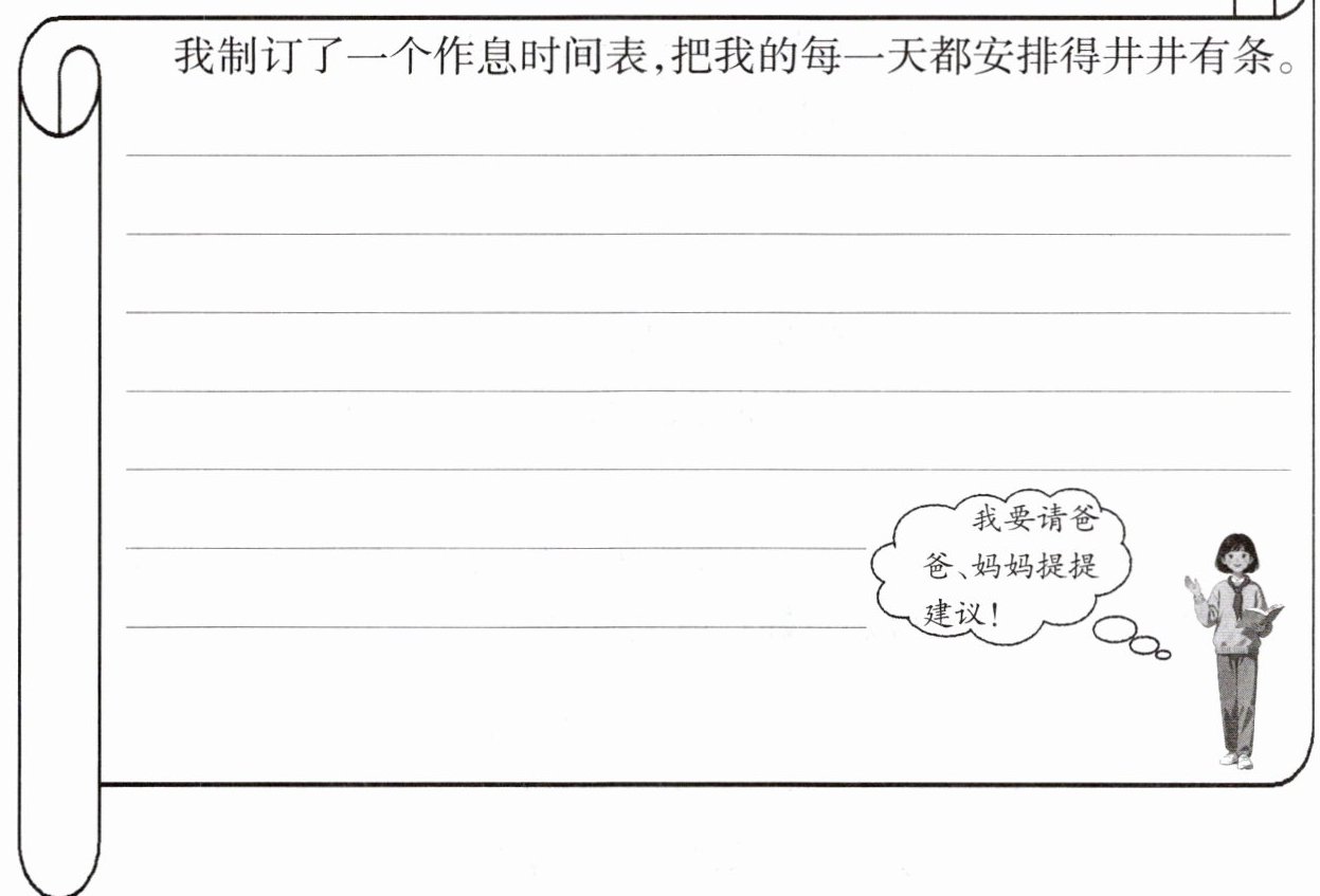 @@爸爸、媽媽的建議:1.每天安排一小時體育鍛煉。2.每天有一小時自由活動時間。3.晚上九點半前睡覺,保證充足睡眠。