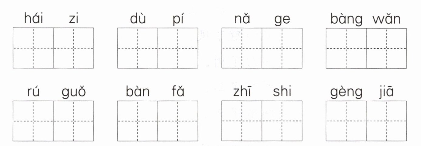 根據(jù)拼音依次寫出對應(yīng)的詞語?!癶ái zi”對應(yīng)“孩子”;“dù pí”對應(yīng)“肚皮”;“nǎ ge”對應(yīng)“哪個”;“bàng wǎn”對應(yīng)“傍晚”;“rú guǒ”對應(yīng)“如果”;“bàn f?!睂?yīng)“辦法”;“zhī shi”對應(yīng)“知識”;“gèng jiā”對應(yīng)“更加”。