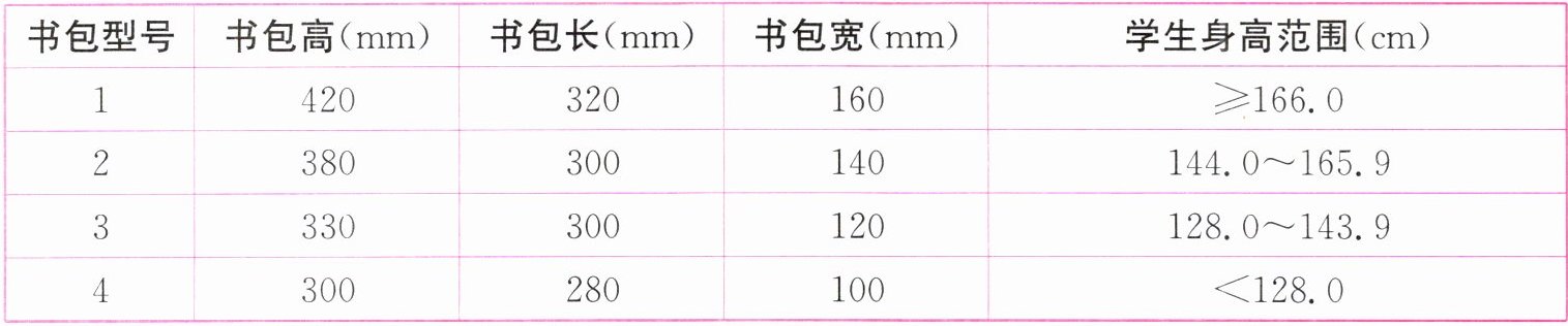 表一 $4$種型號書包的主要尺寸及學生身高適用范圍