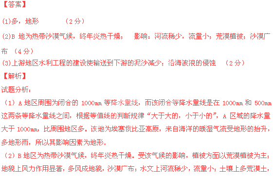 (1) A地年降水量比周圍地區(qū)_______。其影響因素是_______。(2分)