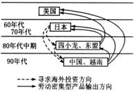 根據(jù)“20世紀(jì)60~90年代,亞洲出口型勞動(dòng)密集型工業(yè)分布變化圖”,回答