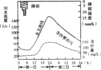 (1)假設(shè)暴雨發(fā)生時(shí),該河谷的森林早已被砍伐,試在圖中繪出可能出現(xiàn)的河流流量曲線和含沙量曲線。