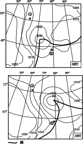 下圖是某日08時和20時海平面氣壓分布圖(單位:百帕),讀圖回答下題。