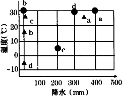 下圖是四個(gè)地點(diǎn)1月(▲)和7月(●)氣溫及降水情況示意圖,讀圖回答下題。