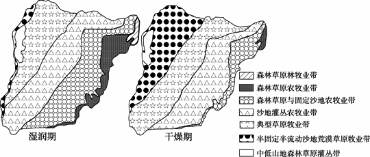 濕潤期來自西部的水汽增加,使自然地帶向西部擺動